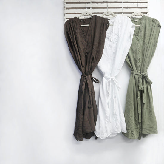Khaki cotton shift dress with buttons and belt 2 per pack CE83723K